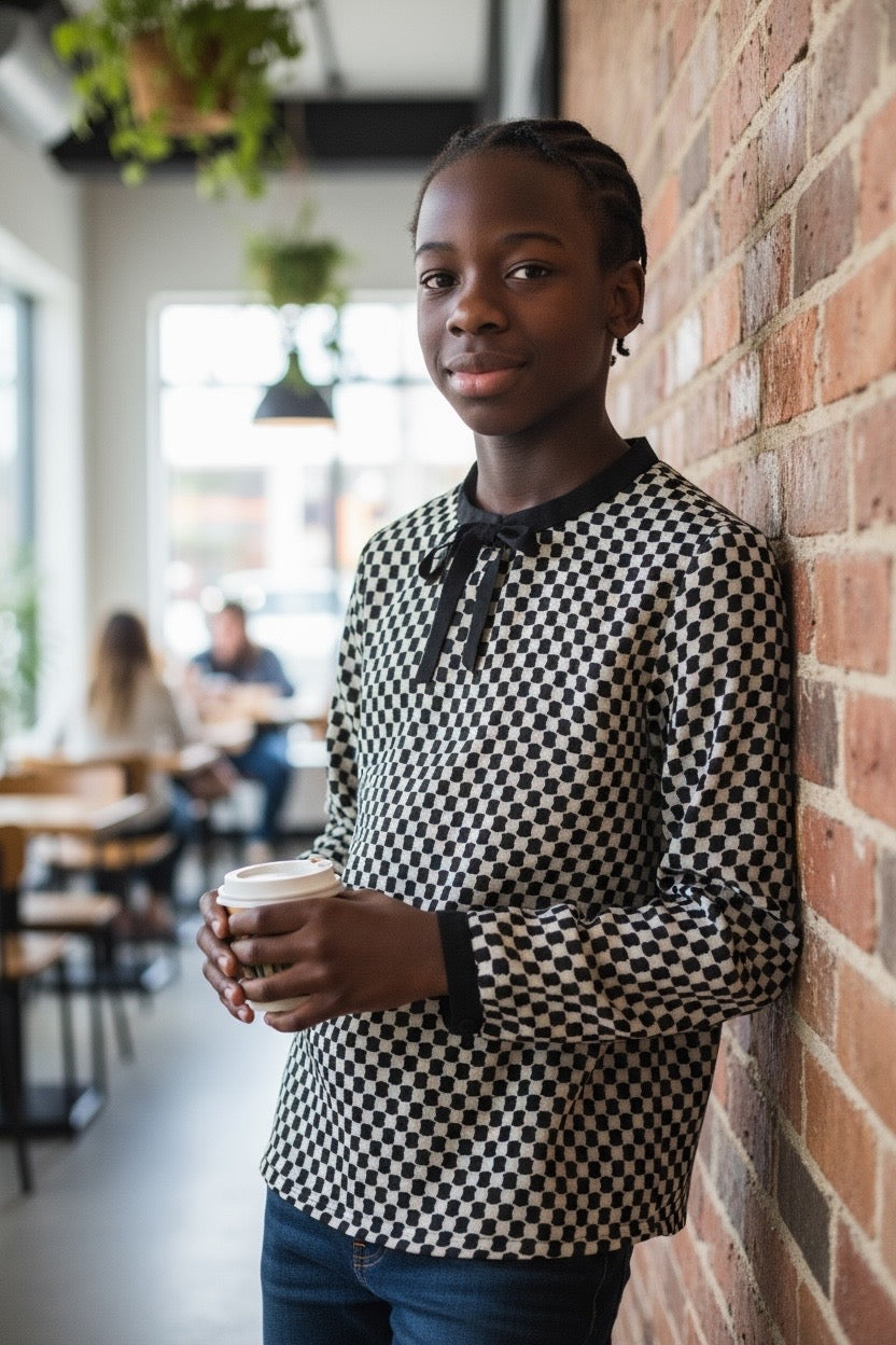 A modern twist on timeless charm. This Kate Spade blouse features a classic black-and-ivory checkered pattern with delicate details — a soft bow at the neckline, gathered sleeves, and black trim accents. Lightweight and silky to the touch, it blends sophistication with everyday comfort.